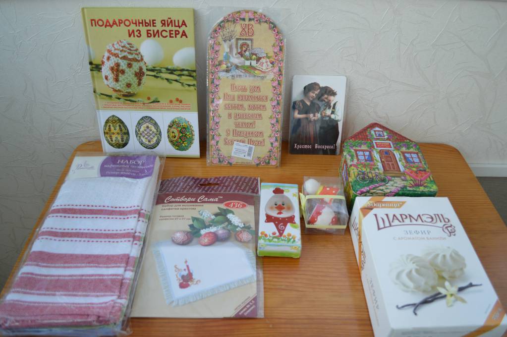 Наши богатства: красивая открытка с поздравлениями, подставки для яиц, книгу по бисероплетению яиц (Незабудке), набор для вышивания Пасхальной открытки (Добрянке)