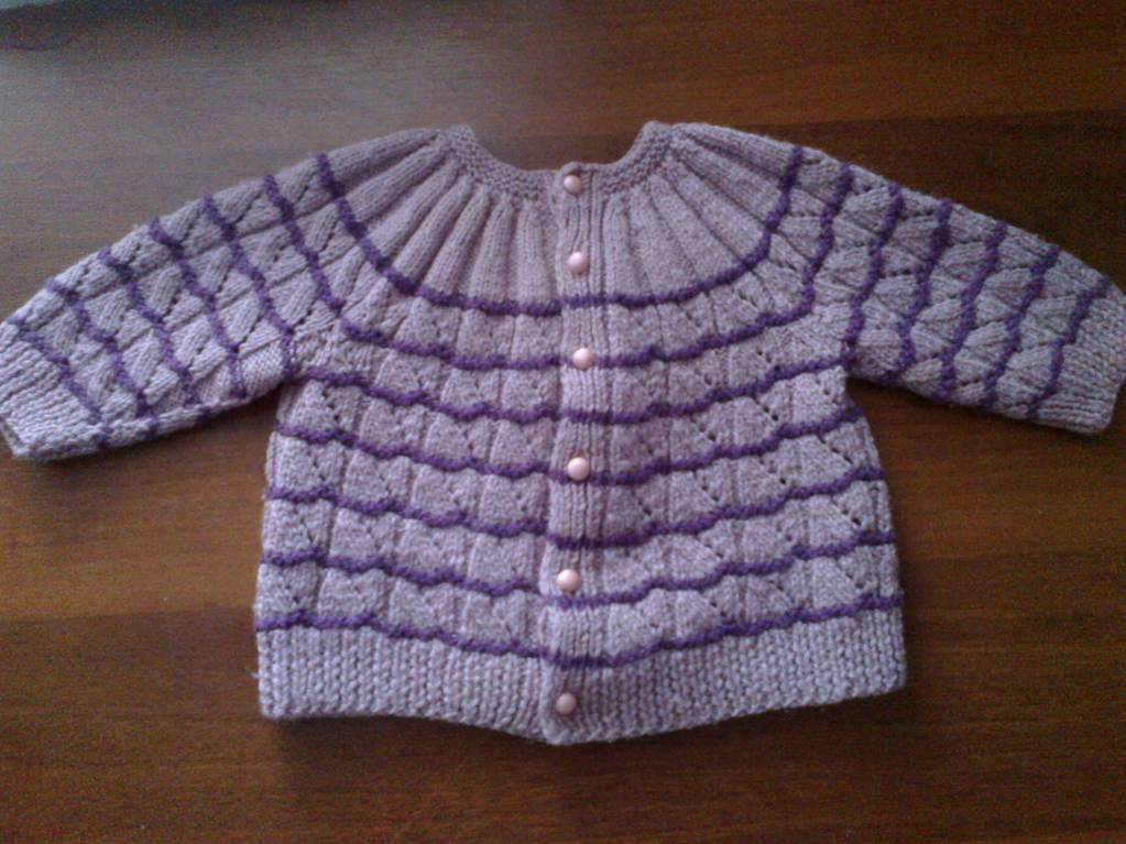 Небольшие вязаные вещички для Нюточки. Фиолетовая кофточка связана так же:
