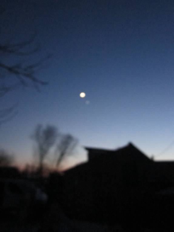 Нас замело, все в сугробах, прям зимняя красота. А за пару дней до Рождества на темном небе появился молодой месяц, а возле него одна единственная звездочка и невероятно яркая. И все, вокруг на небе ни одной, даже самой малюсенькой звезды не было. Я пыталась сфотографировать, но получились только размытые пятна