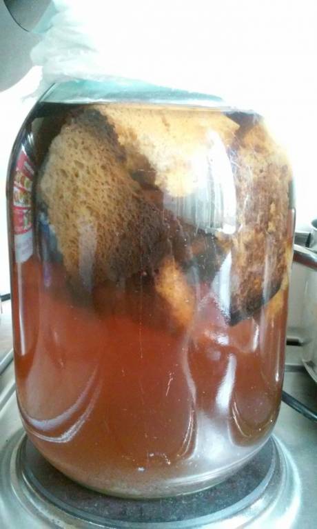Вот мой квас. Видно что небольшой осадок появился и все и хлеб набух.