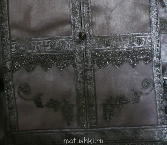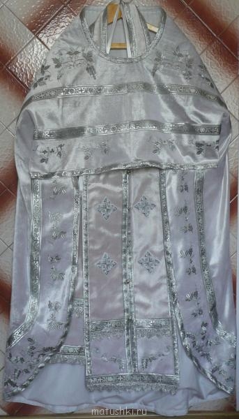 Продолжаю дальше. На белой фелони батюшка прожег дырку снизу, пришлось всю ее распороть и сделать вышивку, а так как только снизу ее нельзя было сделать, пришлось и верх голгофы расшивать. Вышивка выполнена металлическими нитками под серебро, вышивка машинная. В голгофу вставлена пластмассовая сетка. Вышивка также выполнена и на епитрахили и набедреннике.