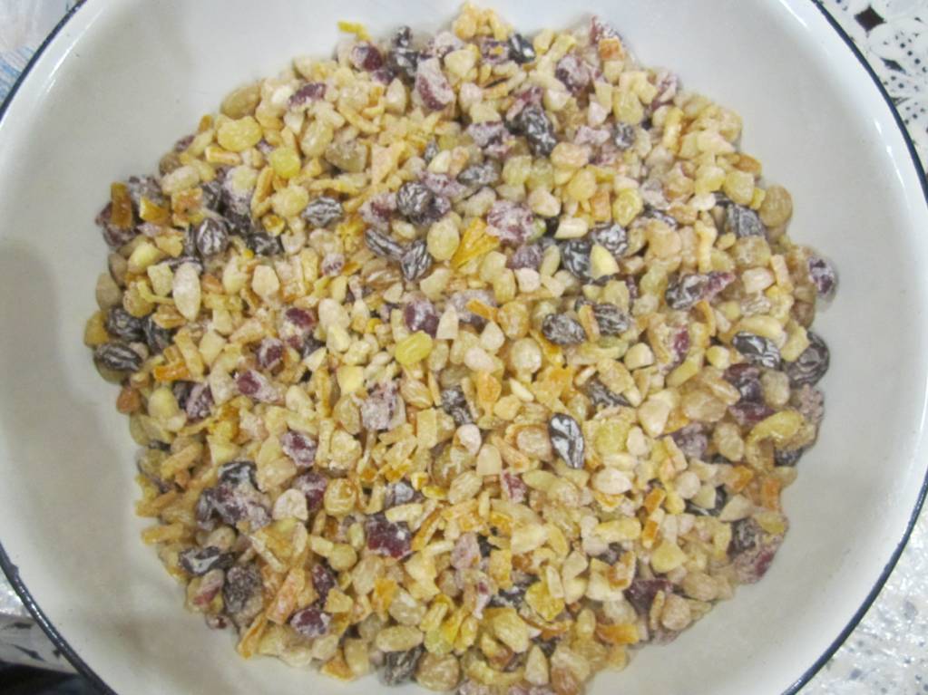 Пока подходила опара, высушила на полотенце изюм, миндаль и клюкву. Нарезала цукаты. Потом все перемешала и пересыпала мукой, чтобы не было пузырьков в тесте.