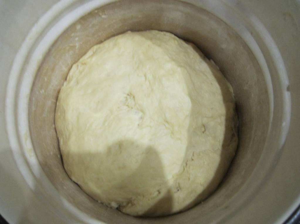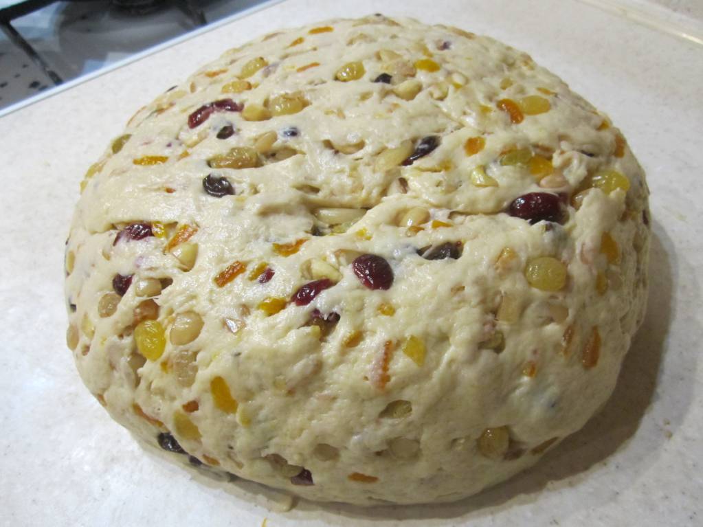 Когда опара подошла, вымесила тесто. Подошло, обмяла. Потом подошло еще раз (больше часа стояло возле печи) Обмяла и добавила изюм с цукатами.