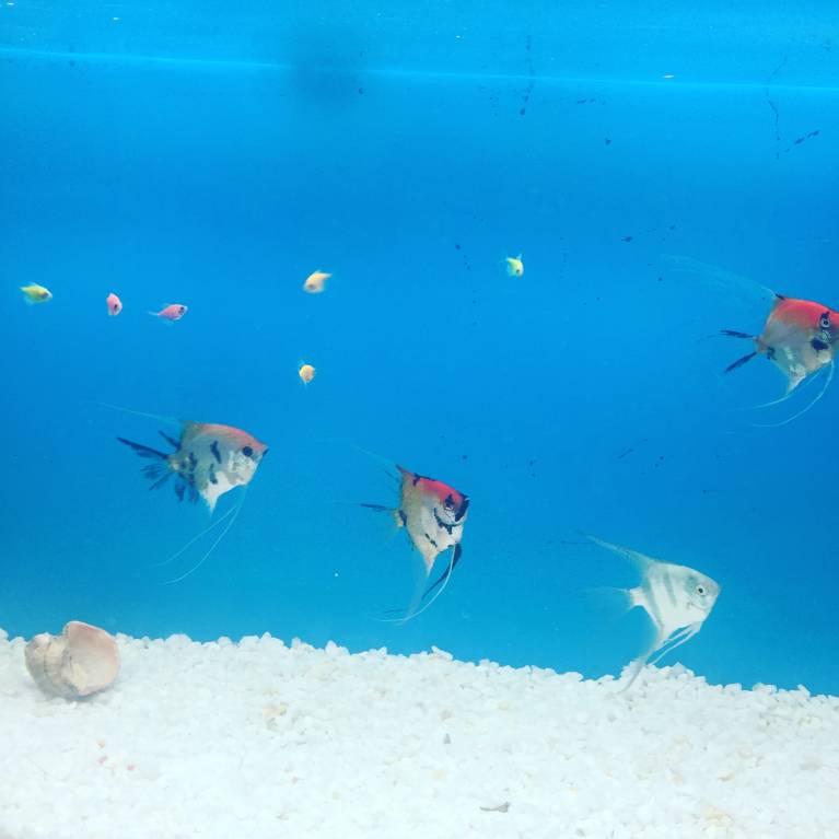 Белая мраморная крошка, синие лампы, отсутствие растений и декора - купить не успели:), запускали и то по суперускоренному варианту, сперва по совету продавца залили кондиционер для воды, через пару часов какие-то ещё бактерии. Приобретены: пять скалярий, семь генномодифицированных тернеций (новинка на рынке, выведены относительно недавно в неоновых тонах), два полосатика, забыла, как называются:), ягуаровый золотистый сом (прячется за фильтр и поэтому отсутствует на фото) ну и туда же петушка выпустили, который тоже мгновенно спрятался и почти не вылезает. Муж засматривался на дискусов, но я отговорила - уже есть опыт, они капризные и дорогущие, жалко будет, если опять прикажут долго жить, попросила взять рыбку попроще, голосовала вообще за стерлядь:).