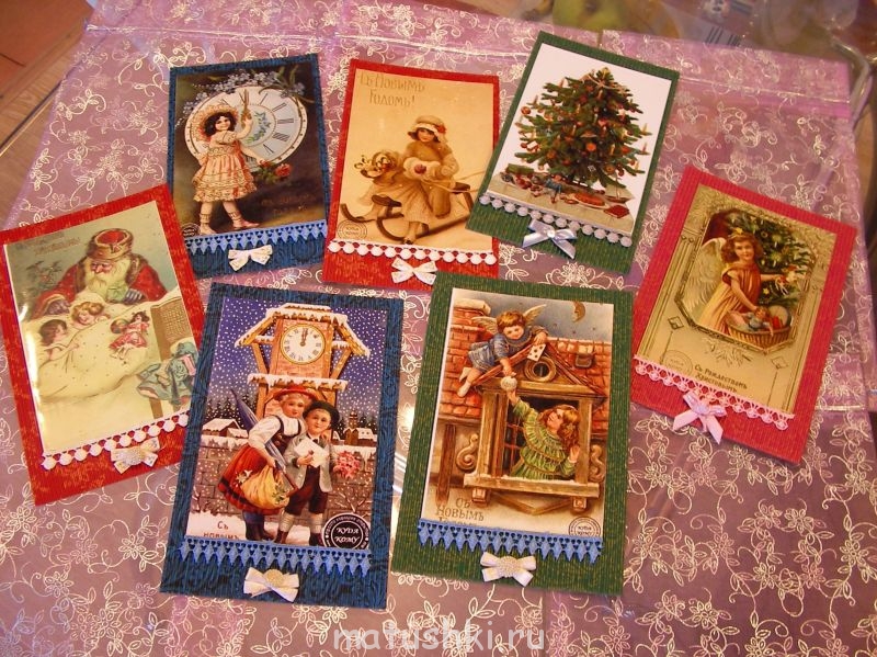 Да, из интернета скачала, распечатали на фото-бумаге(в фото студии) и наклеили их на гофрированный картон ну и украсили бантиками , ленточкамиЁжик в тумане:Картинки из интернета распечатывали или это готовые открытки украшали?