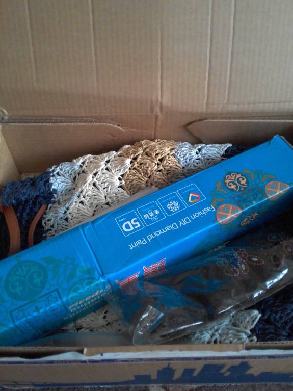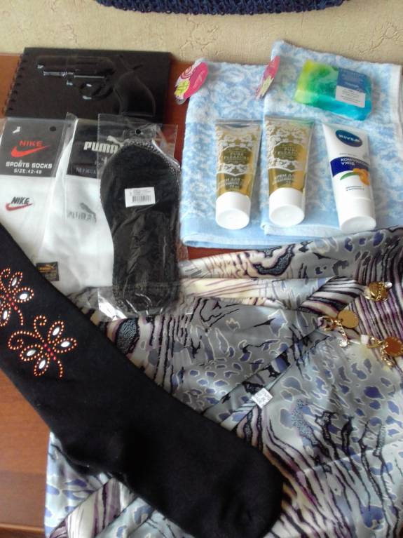 .И так Катя прислала нам: сумочку, шёлковую косыночку, носочки, гольфочки, следочки, полотенчики, мыло ручной работы, крема для рук и тела,пасхальная свеча, цветочную отдушку уже пересыпали в вазочку. Блокнот, младшенький забрал себе, набор для вышивания крестиком, набор алмазной мозаики( очень красивый пейзаж), страмин и крючок для него,обязательно попробую этот вид рукоделия, книгу Ю. Вознесенской " Мои посмертные приключения", читала несколько лет назад