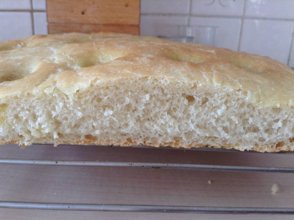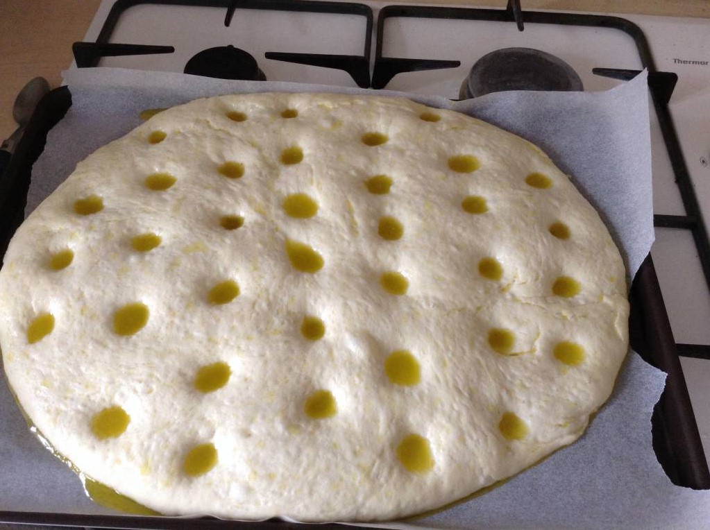 Выложить в слегка смазанную раст. Маслом миску, оставить в теплом месте (слегка прогретой духовке) на 10 минут, выложить на противень, застеленный пекарской бумагой, оставить в теплом месте еще на 10 мин, осторожно раскатать скалкой до толщины где то в полтора сантиметра, еще 20 мин в теплом месте, сделать эмульсию из 3/4-1 ч.л. Соли, по 30 мл воды и оливкового масла, вилкой взбить до однородного состояния, пальцем равномерно сделать углубления по всей поверхности теста. Мягкой кисточкой нанести всю эмульсию, оставить еще на 10 мин. По их истечении включить духовку на 200 г, и еще через 10 мин поставить в духовку фокаччу на 15-20 мин. Определить готовность можно по цвету, фокачча должна остаться почти белой и только только начать подавать признаки подрумянивания! Румяная фокачча - уже перепеченная!