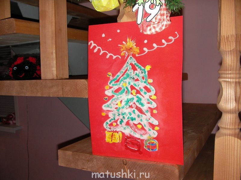 Берем лист цветной бумаги. Рисуем клеем елочку и обсыпаем манкой(можно солью) затем лишнее сдуваемСhernika:А как Вы делаете елочки из манки?