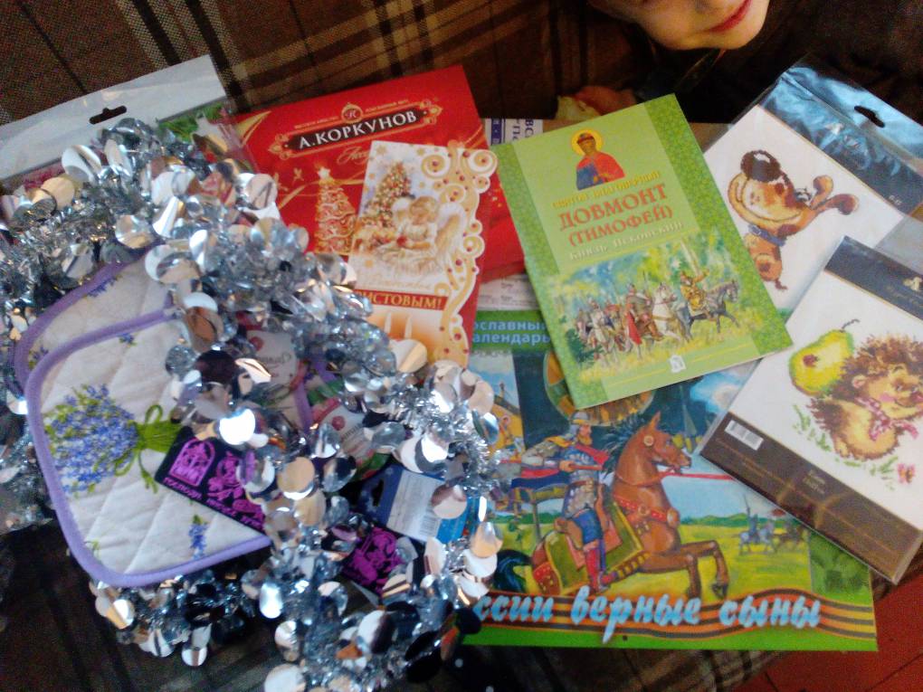 сыну-милитаристу - военно-православный календарь и книга про Довмонта-Тимофея. Теперь сынулю и до вечера не унять - скачет и ликует. И для всех - украшение на ёлочка - гирлянда - и конфеееты. Спасибо огромное за все, дорогая!