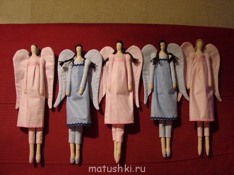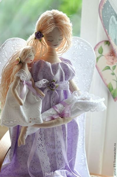 Два таких Ангела были подарены на Рождество крестным моих девочек, а три живут у нас дома, два у кроваток девочек, а один мой. Все большие зайцы и маленькие куклы были сделаны в подарок. А большие куклы сделаны на заказ и проданы. Мне очень нравится шить куклы,маленьких куколок ещё можно разместить и ими можно играть детям. А большие - это все-таки интерьерные куклы. Ими только любоваться.