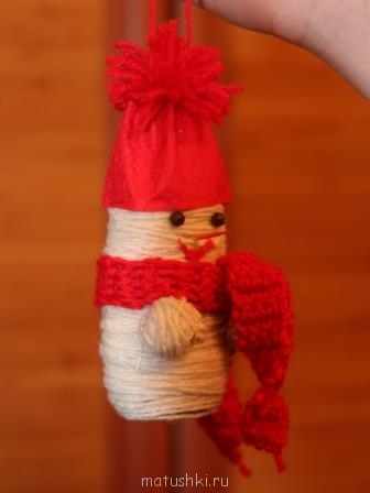 3. Флакончик п/э из-под шампуня, сверху кусочки двустороннего скотча, сверху намотана белая пряжа. Шапка - фетр, шарф (крючок) и бубон - из шерстяной пряжи. Глазки - бусинки (полусферы, приклеенные), нос - зубочистка, воткнутая в оный флакончик и покрашенная фломастером.