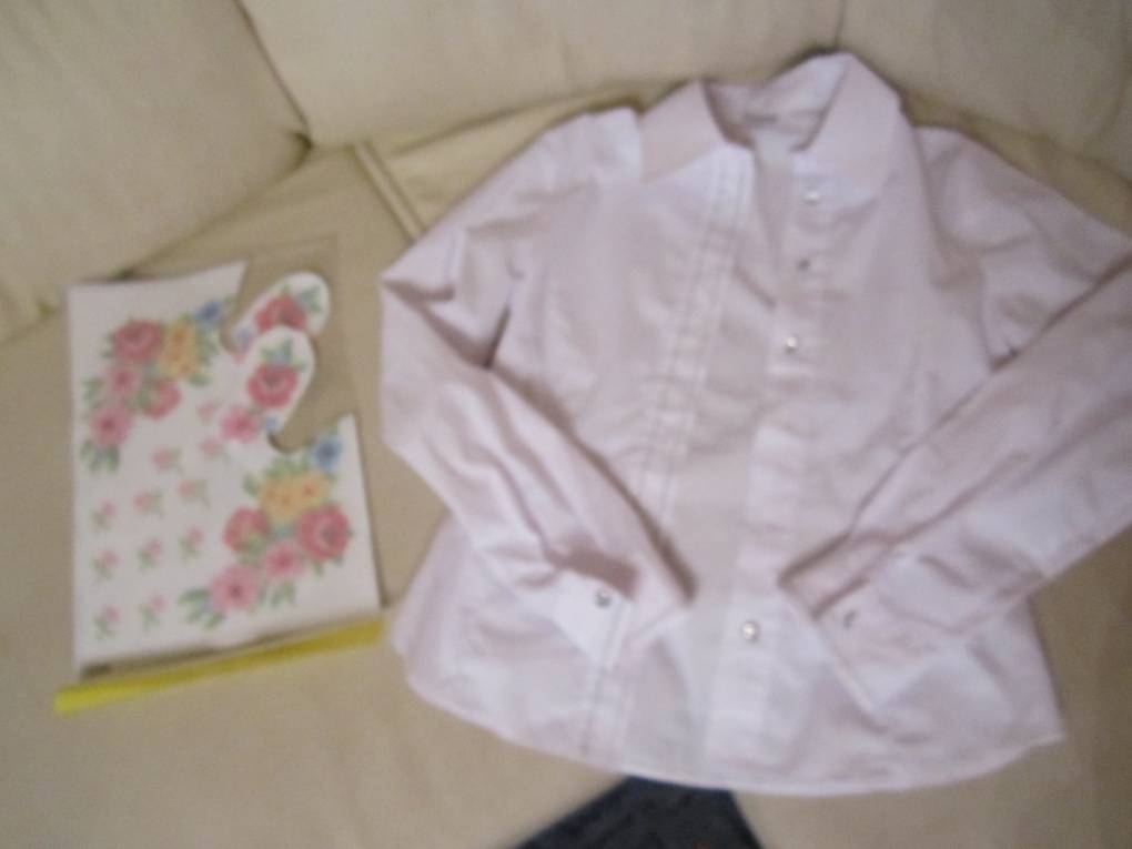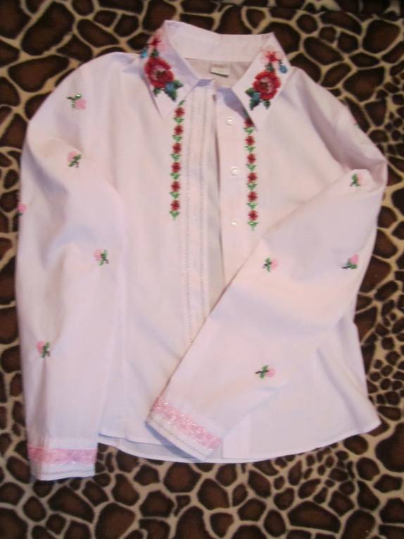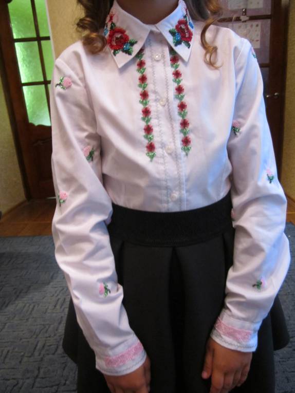 Младшая вышила блузку себе на первое сентября. Блузка не новая, взяли у старшей. Моя работа: пришить флизелин, завязать/развязать узелки. Плюс две полосочки впереди я сама вышила, потому что Настя не успевала. Все остальное: воротник и рукав с манжетом полностью ее работа.