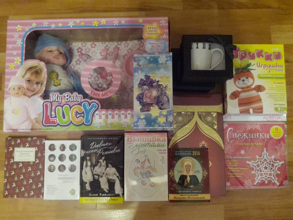 . Далее две кружки для меня и мужа, вкусные конфеты. И книги для семейной библиотеки - календарь на 2016 год с акафистом Святой блаженной Матроне Московской, книга "Матушки" (давно хотела прочитать), "Рождественские рассказы зарубежных писателей" тоже давно в списке желаемых и "Дневники княжон Романовых", а я очень трепетно отношусь к царской семье. И открытка с добрыми пожеланиями для нас. Ещё раз большое спасибо от всей семьи и меня за такой приятный новогодний и Рождественский подарок!