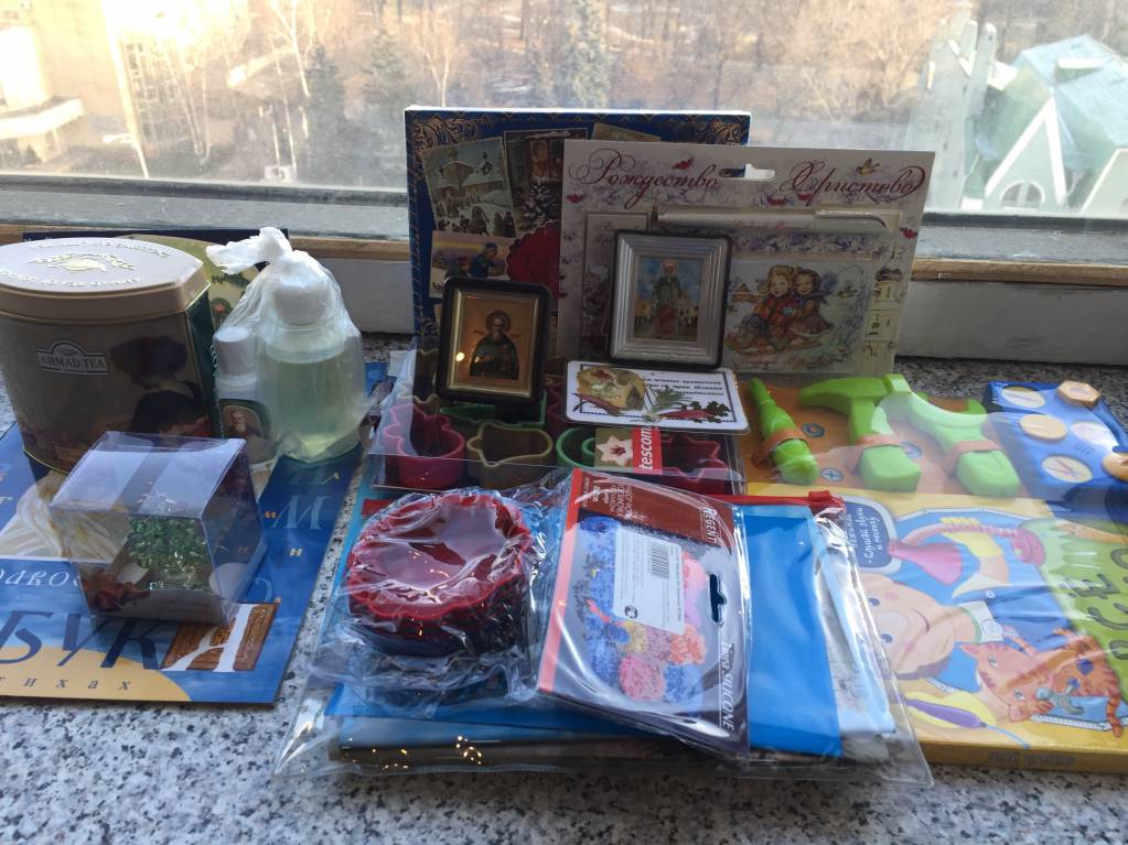 ), деревянная развивающая игрушка для Никуши, набор для изготовления модели самолета из картона, чай в жестяной баночке и много-много духовной литературы:), кажется, жития и акафист св.Ксении Петербуржской и св. Иоанна Кронштадского, их же иконки и освященное масло; ещё игрушка на елку и формочки для кексов и печенья! Спасибо большое, я очень рада, что поучаствовала в акции, так тепло на душе:).