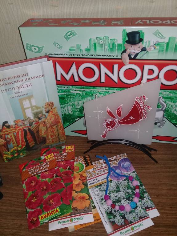 , больше всего я рада, что "Монополии" у вас нет - просила Свету уточнить, но вдруг вы ее успели купить за время акции:). Семена мне помогала приобрести тетя:), мысль про наушники мне в голову пришла в последний момент, насчёт того, что они никогда не лишние, а у Даши еще было зеркальце. Может, рановато для использования по назначению, но пусть пока играет:), я резиночку для волос не нашла ей перед отправкой, а она, оказывается, в коляске у меня лежать осталась. Пирамидку пришлось вытащить из упаковки и положить россыпью, иначе она в коробку не влезала.