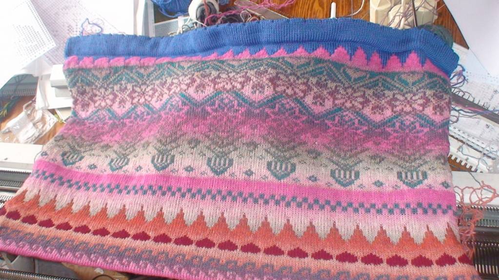 Во-вторых, начала вязать пальто весенне-осеннее на продажу. Связала часть спинки, но потом сняла с петель, т.к. поступил срочный заказ и нужно было освободить машинку.