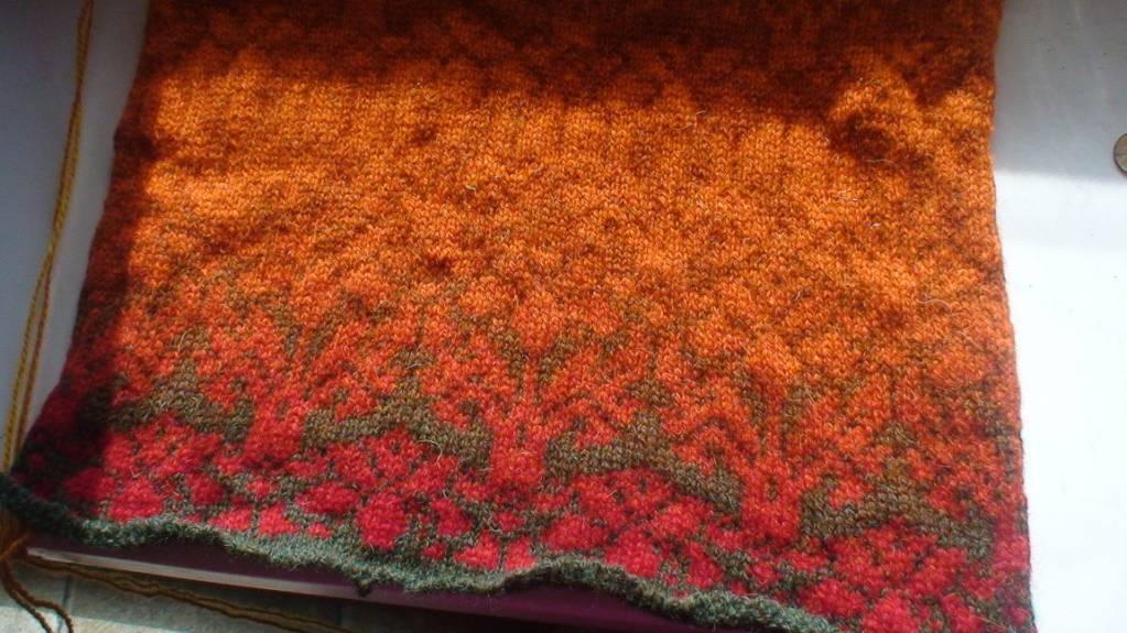 И в-четвертых, я связала себе удлиненный жакет-безрукавку. Он уже сшит, осталось связать и пришить планки к полочкам и проймам. Захотелось роз. Много. Австралийский меринос + дундага