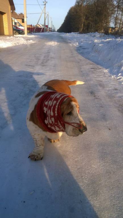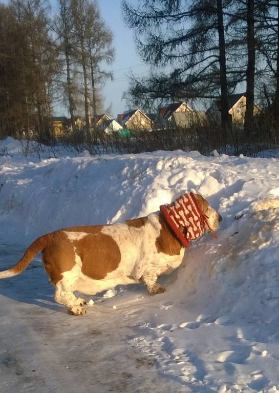 Шапочка "Косточки" для пожилого бассета Гоши. 75% шерсть, 25% нейлон.