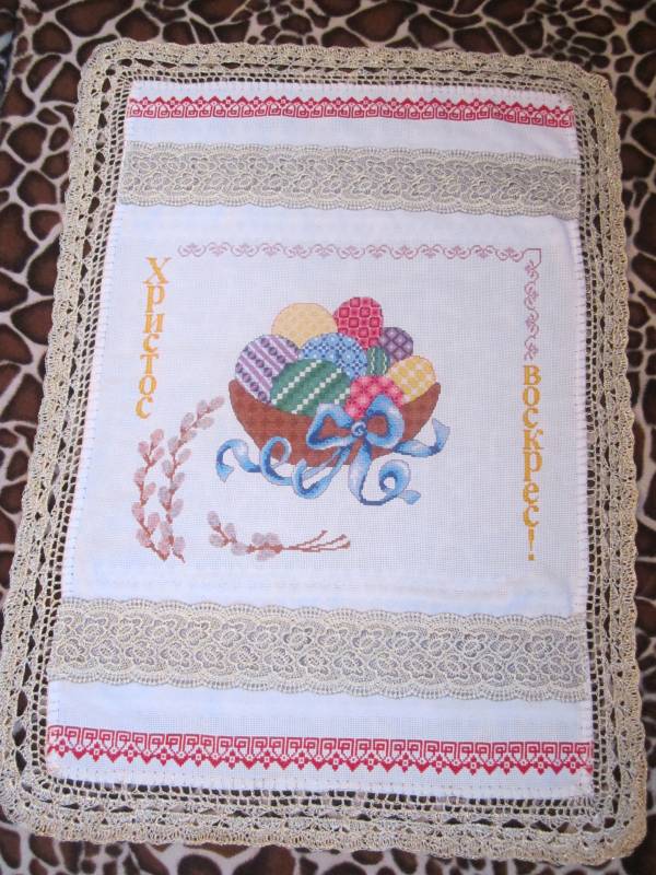 Самую большую (50*70 см) три года мучала. В первом только красную дорожку вышила, на второй год корзину с яйцами и обвязала края, а в этом уже добавила полоски кружева и довышивала.