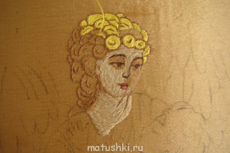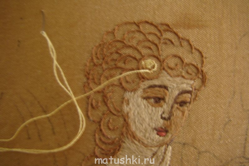 rimma, волосы закрашиваем нитью 3248. Мне удобно начинать с середины кудряшки, и идти потом по кругу наружу. Оствь незакрашенной полоску. Это ленточка, сделаем ее голубой.