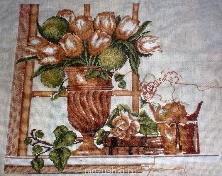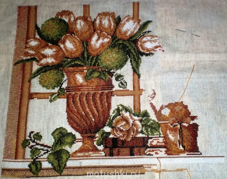 Пытаюсь сообразить, куда бы приспособить эту вышивку. Вообще-то хотела подарить ее свекрови, только не знаю, в каком виде? Просто на стенку, или, может, что-то типа подушки диванной сделать? Как такой натюрморт вообще на подушке будет смотреться? Не хочется промахнуться, потому что картинка эта очень нравится, да и свекровь хоть как-то надо порадовать, а то я невестка непутевая, сплошное огорчение