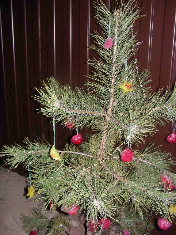 Повесили в пятницу( морозец наконец-то) замороженные игрушки на уличную елку . А вчера опять оттепель и все игрушки попадали, одни ниточки на веточках остались.