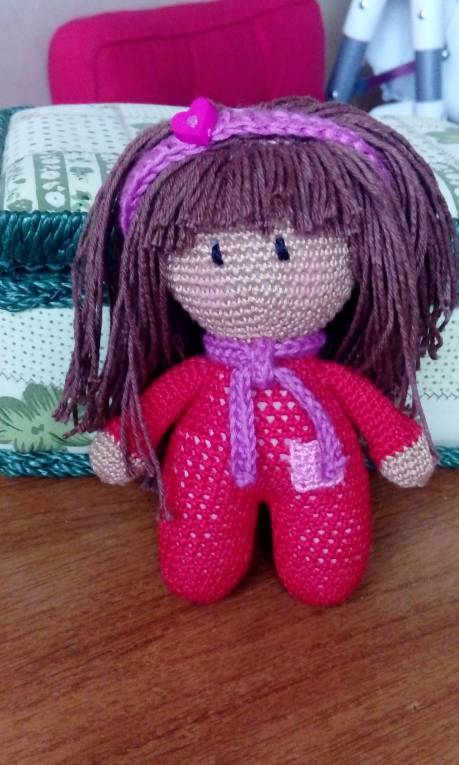 Еще одна, благодаря Григорьевне, решилась сделать волосы как она говорила, дочке очень понравилось. Мне не понравилось что просветы, выбрала не правильно крючок.. но лень было переделывать... оставлю ее дома, как наглядное пособие-как не надо делать