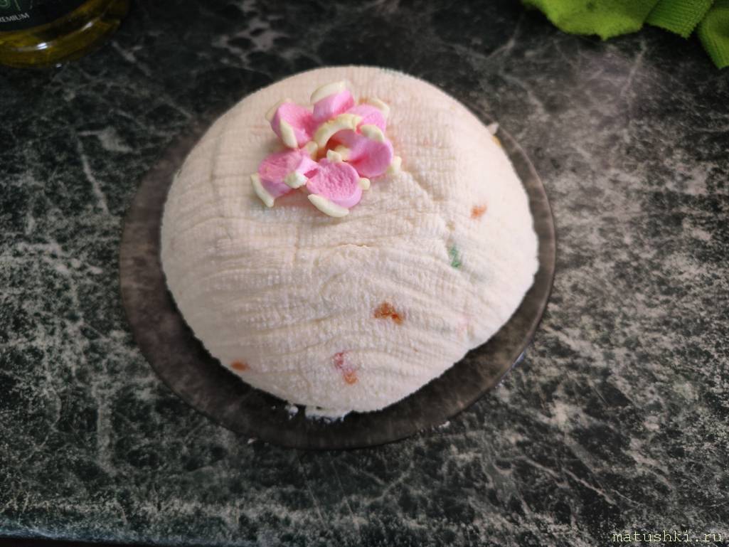 По рецепту Энди-шефа, без марли (замораживается). На мой вкус жирновато, но убавлять не рискнула, всё-таки за счёт жиров держится форма. А так очень красиво и вкусно.