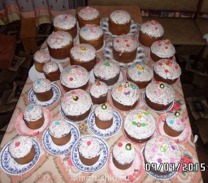 А я не успела много спечь, у меня четыре больших, два маленьких, один детский. А все приглашенные гости звонят и спрашивают, будет ли им кулич домой выдан.