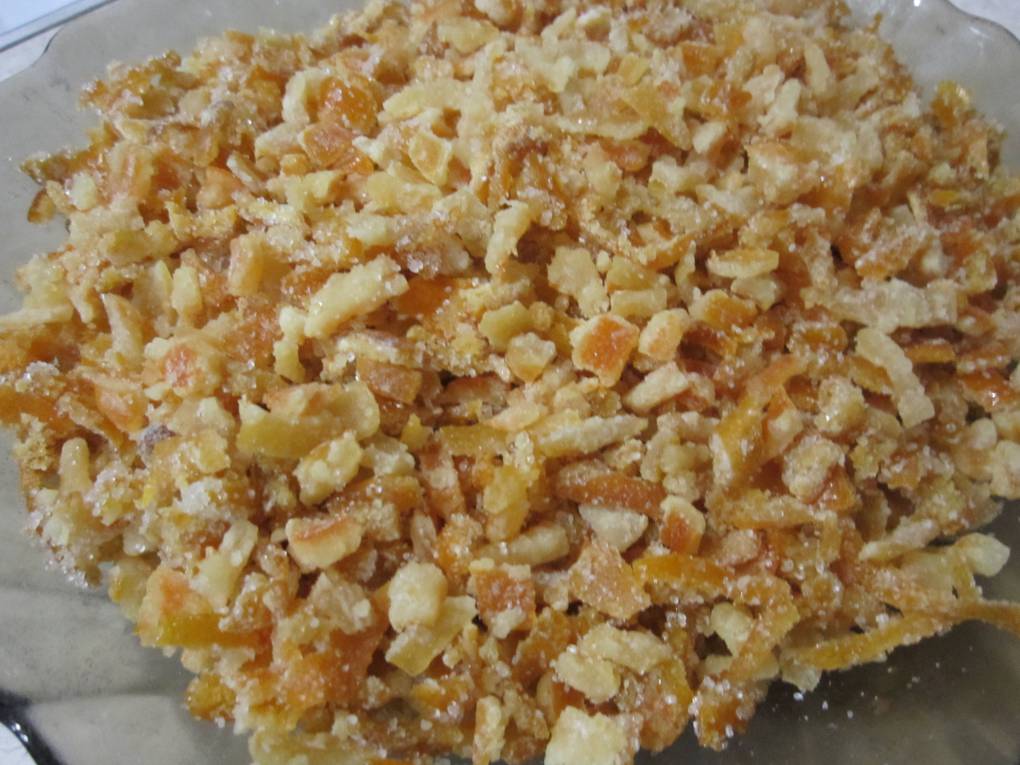 Старалась удалить белую мякоть под коркой, чтобы не горчили, а в результате цукаты получились жестковатыми. А там, где белая мякоть осталась - в процессе варки она расквасилась.