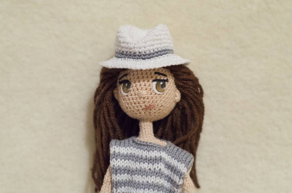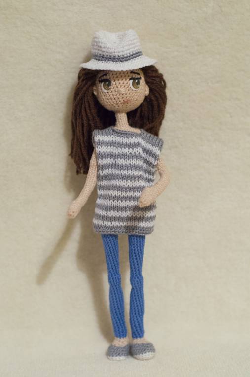 Поддалась модному веянию и создала каркасную куклу. Связана в подарок по просьбе моего мужа регенту молодежного хора нашего собора, любящей шляпы-федоры. Я пыталась сделать портретную куклу, но получилось не совсем похоже. Регент невысокого роста и слегка полненькая, а кукла вышла высокой и худенькой