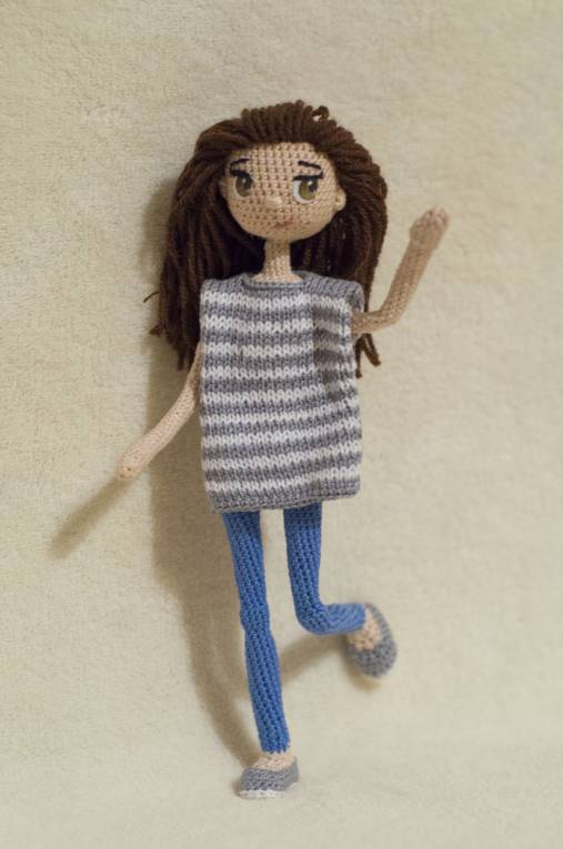 Внутри куколки проволочный каркас, поэтому она может принимать разные позы. Глазки рисованные, волосы из шерстяной нитки. Связана полностью из хлопковой пряжи. Ростиком вышла 21 см. Стоит самостоятельно.