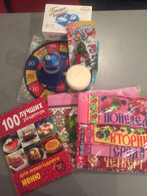 В посылке обнаружилась масса полезных и нужных предметов: фартук и прихватки (стыдно признаться, но у меня в хозяйстве до сих пор отсутствовал фартук, именно поэтому я заказала его в анкете), набор кухонных полотенчиков "Неделька", книга кулинарных рецептов, конфеты, дартс для сына (вечером папа будет показывать класс:)), открытка с тёплыми пожеланиями, новогодний шарик и, что больше всего порадовало - крем-суфле для тела с ароматом груши, как раз вчера обнаружила, что мне совершенно нечем намазаться после душа, и вот подарочек подоспел вовремя!