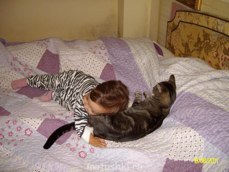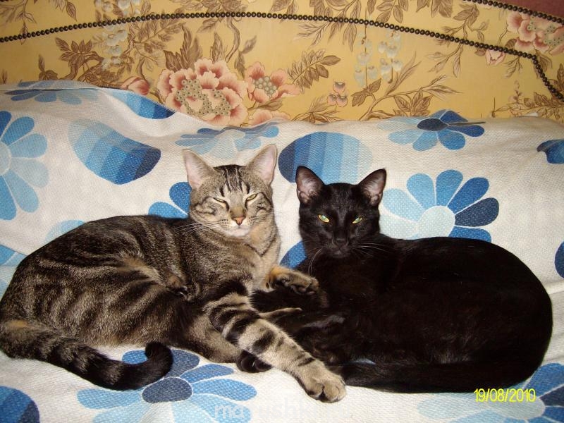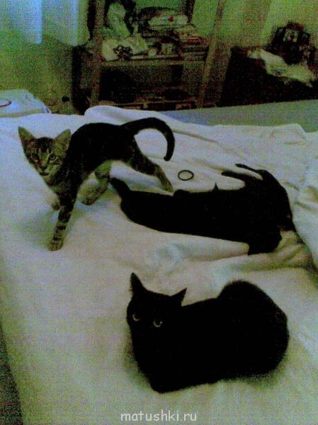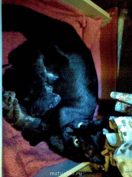 одно фото почему-то про дублировалось.. ну да ладно,продолжу свой рассказ. так как мама черная два мальчика были черными,папа полосатик,два мальчика полосатики,девочка одна,видимо ей больше раскраска папина приглянулась,по этому она и появилась на свет средней и полосатой. когда котятам исполнилось 3.5 мес я поместила в и-нете объявление и раздала котят, Мурчика отдать не смогла,а Недья(медвежонок,косолапый)тот который черный,сбегал и прятался когда приходили люди за котёнком. Так что он у нас остался по собственной воле. это мы пришли с роддома и черный кот(а он у нас трусишка страшный) впервые увидел малыша,сидел так над ним мин 15 и ничего вокруг не замечал