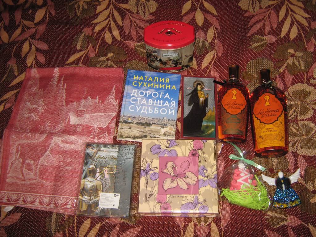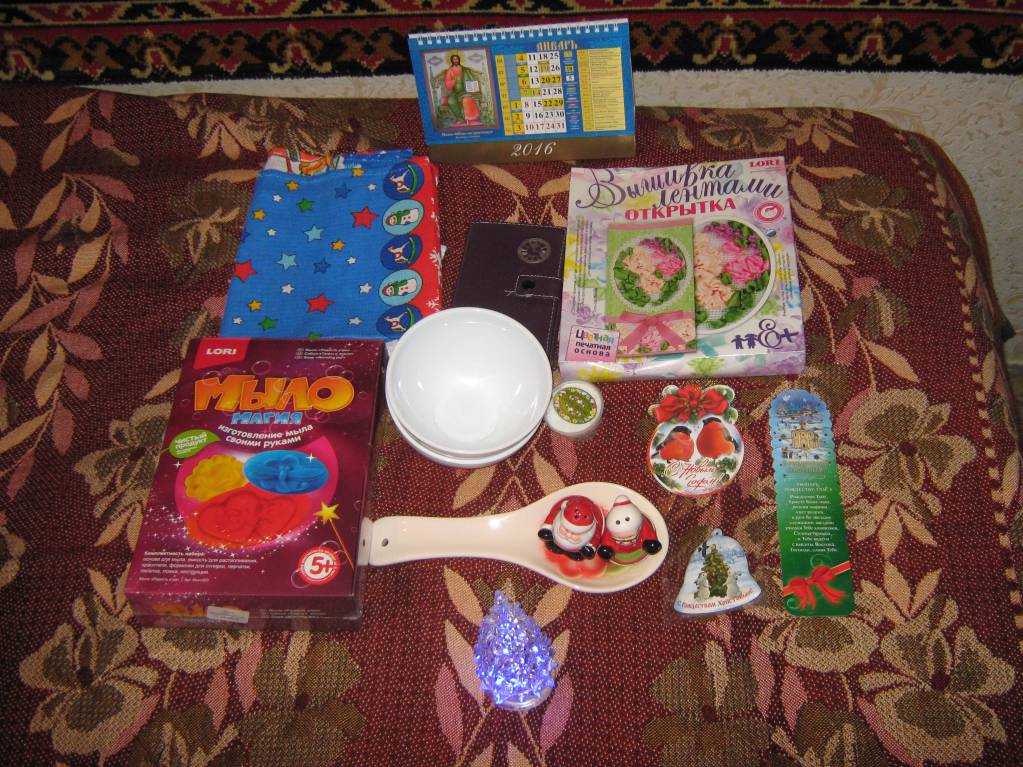 2 салатника с милыми цветами, подставка под ложку на кухню, дед мороз(солонка) с мадам мороз (перечница-старой назвать рука не поднимается, такая добрая-добрая),полотенце новогодней тематики, ежедневник, календарь, закладка, открытка, ладан, магнит на холодильник и два набора (мыльный и вышивальный)Маленький штрудель до съемки не дожил, но мне маленький кусочек достался-очень вкусный насыщенный вкус. Спасибо Танюша!!!!
