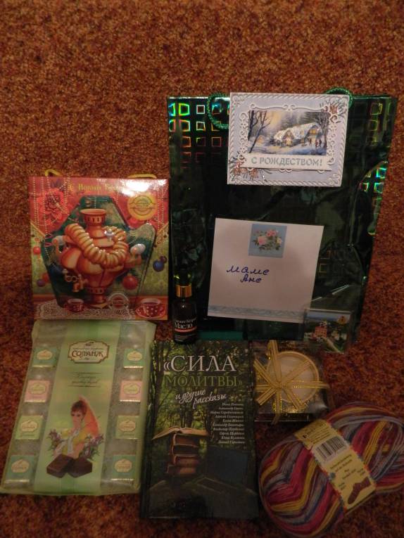 А мне наша милая снегурочка подарила: книгу, кедровое масло, красивую свечку, нитки (свяжу себе носочки), магнитит Рязань,шоколадные конфеты и чай (убрала до Рождества).