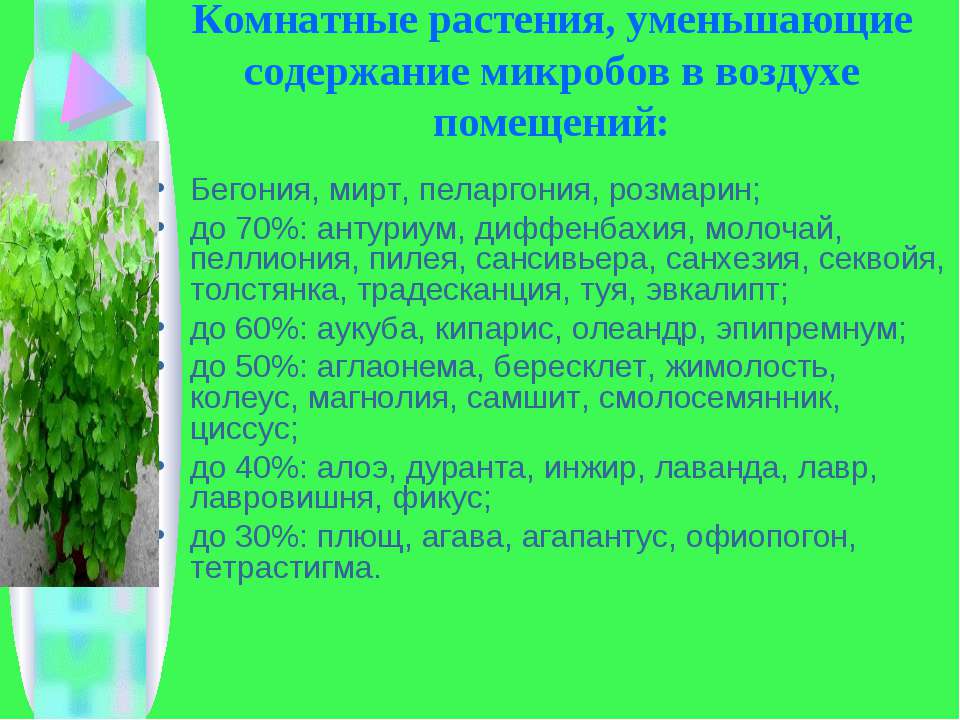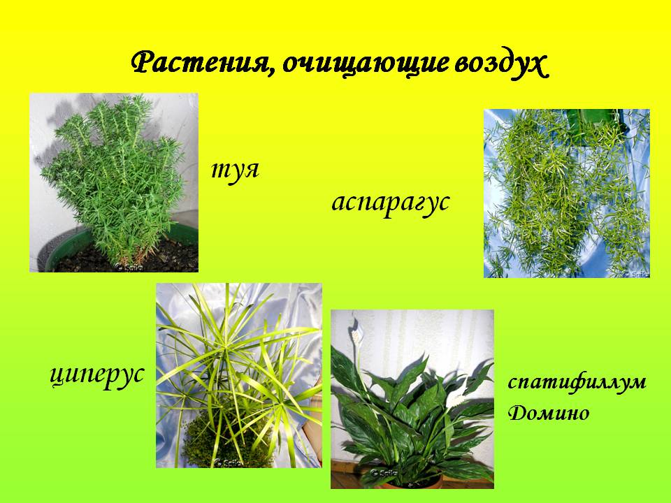 проще выделить группу растений, обладающих фитонцидными свойствами. Которые очищают воздух от вредных составляющих(к последним относят хлорофитум- название сложнопроизносимо, а растение неприхотливо и встречается повсеместно.