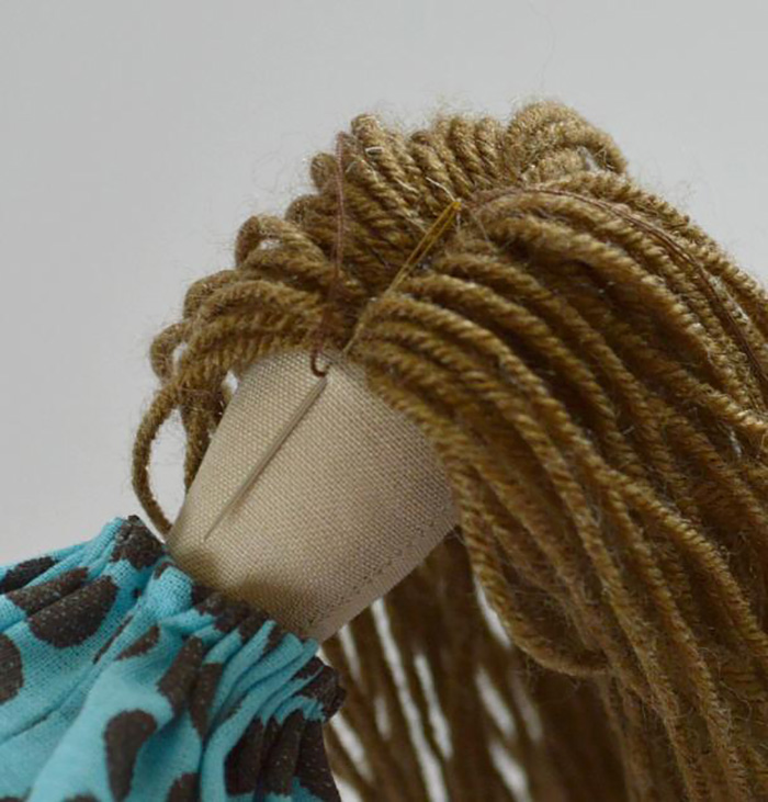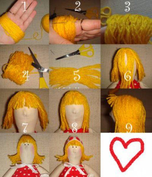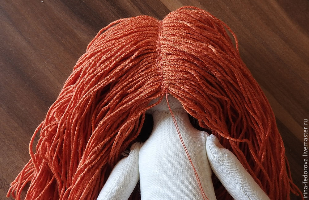 . Сразу пришивать по одному пучку. Или сделать на нить-трессы. У меня будут волосы из пряжи. Сейчас смотрю в интернете, пряжу расчёсывают. Получается немного страшновато.