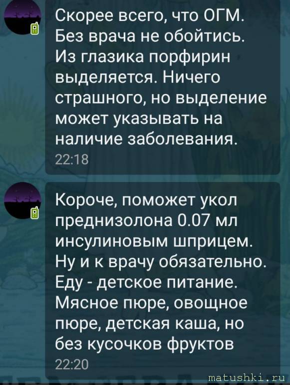 Нашли мы ратолога. Лилочка, это не ОГМ, Слава Богу, а врач склоняется к травме глаза. Он начал подсыхать, назначили капли и обезболивающие. Если это не поможет, то есть вероятность потери глаза. Вот такие дела...