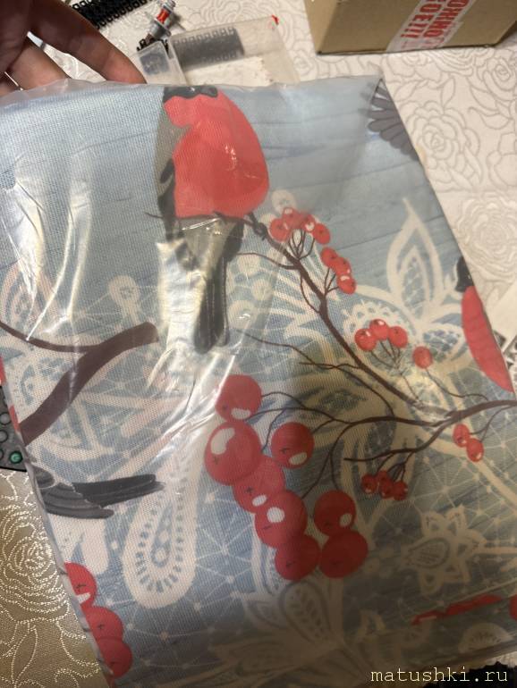 И мне тоже приехала от леди София, замечательная скатерть со снегирями вне рамок акции
