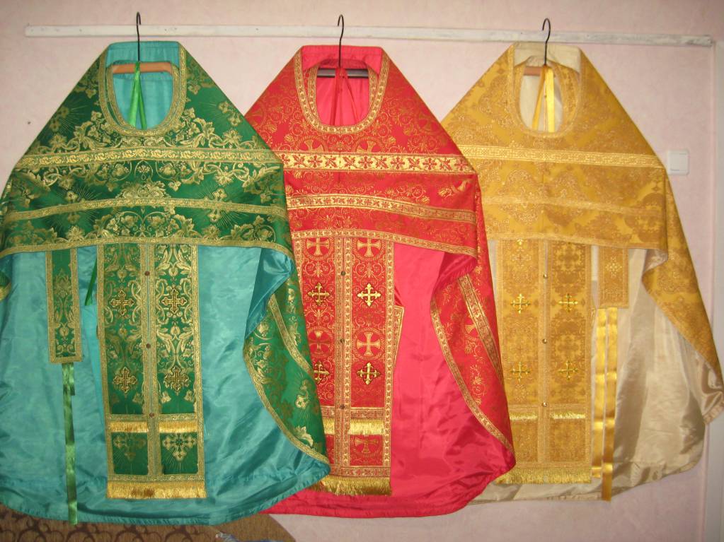 Вот наши с батюшкой ризы, шитьём, никогда не занимались, решили и пошили. Красное самое первое, теперь пробуем по не многу.