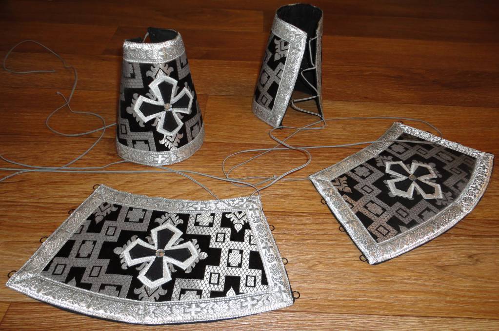 Оплечье я делаю из бортовки в4-5 слоев(от бортовки зависит)Склеиваю все слои и простегиваю по кругу по спирали с края до центра, но не затрагивая по 2-3 см передней части, там с каждой стороны срезается по 2 слоя, чтобы легче было соединить и сострочить.Главное правильно выкроить оплечье, учитывая эти см(если по фото не будет понятно, пишите)Сделаю фото выкройки) На поручи 4 слоя, тоже стегаю. На епитрахиль,1 слой тканевой клеевой и 1 слой бортовки., на пояс 1-2 слоя бортовки.Поручи и пояс тоже усиливаю одним слоем клеевой.Если нужны набедренник и палица, тоже 1 слой клеевой и 2 слоя бортовкиДа, забыла, детали бортовки подклеиваются только к поясу и епитрахили, в остальном действуют, как вложения вовнутрь, таким образом избавляемся от пузырения,но все четко будет держаться в центре крестом, по бокам галуном или бахромой.