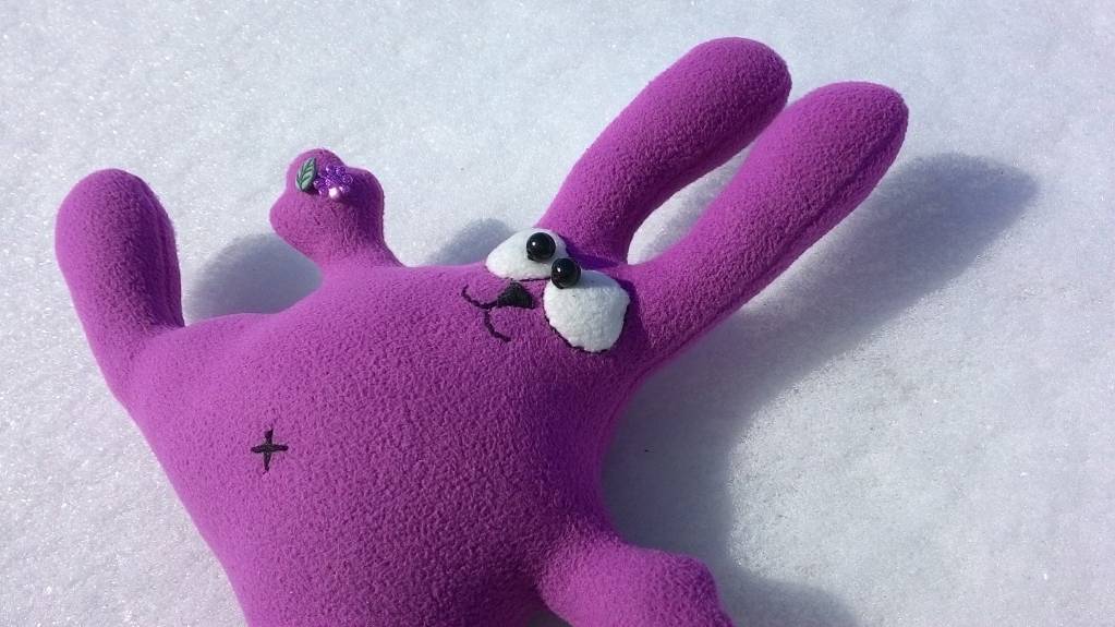 Я тоже шила зайку, только в марте еще дело было. Идея взята у Кэтрин Шварц, она шьет интересные игрушки из офиса. Мой тоже из фиолетового офиса, украшен пуговкой.