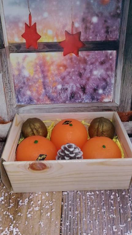 Наклейки как с настоящего мандарина, они продаются в магазинах для мыловаров, или можно самим распечатать макет из интернета на самоклеющейся бумаге.