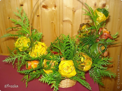 3. Задание предлагаю всем взять одно и то же. Сделать или купить корзину и фрукты, которую украсить осенними поделками, смастерить бусы, грибочки, венки из листьев, всякие поделки из каштанов, желудей, листьев и прочей осенней красоты.