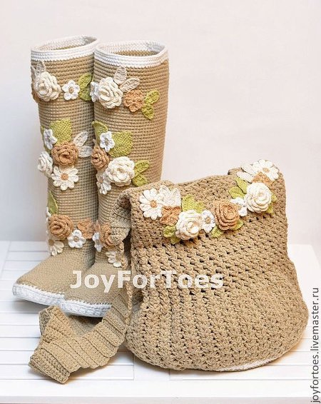 1) два комплекта (сапоги+сумка) примерно таких, как на фото, с моделью сумок еще не определилась, сейчас подбираю основной цвет. Готова подошва, стельки обвязала и уже приклеила.