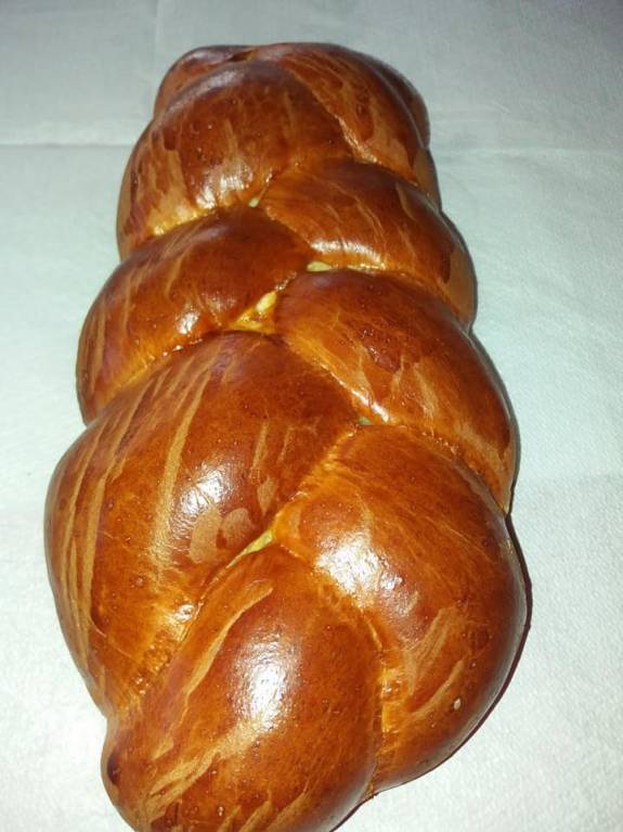 Пасхальный греческий хлеб называется цуреки. Это сладкая плетёнка с яйцом красного цвета. или без яйца. Цвет яйца красный,как символ пролитой крови Исуса Христа.
