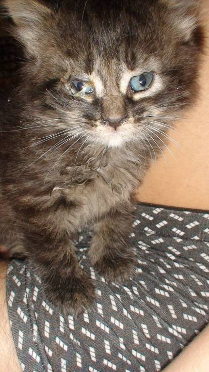 Это совсем крошка. Он даже плохо ходил. Но не это самое ужасное, а то, что он был без глаза. На месте правого глаза впадина и сомкнутые веки. Знакомая взять его не могла - некуда. Оставлять его там - сами понимаете. Я забрала его домой.