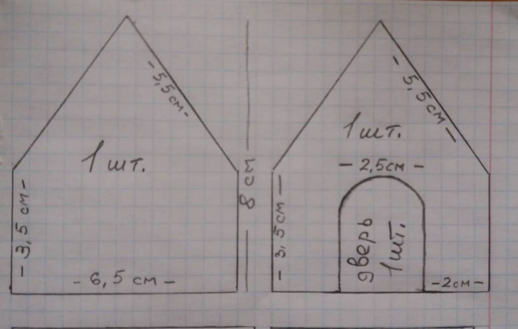 Предлагаю начать пока с небольшого домика. Выкройку перенесла для вас на обычный листок бумаги со всеми замерами