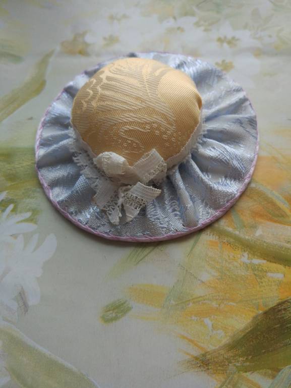 Желто- голубая шляпка- игольница с обычными кружева сделана сперва. Потом сделана розовая шляпка с кружевом стрейч( оно тянется, с ним удобнее работать).